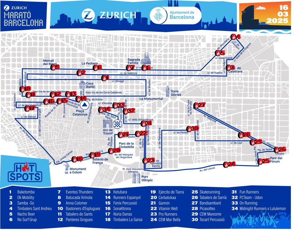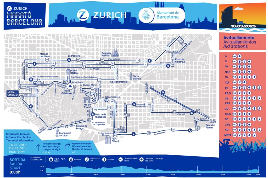 Para su 46ª edición, la Zurich Marató Barcelona 2025 ha optimizado su recorrido para mejorar la experiencia de runners y público, manteniendo la esencia de la renovación de 2024 pero incorporando cambios clave en el primer y último tramo del recorrido, y añadiendo más de 30 puntos de animación (Hot Spots) para disfrutar plenamente de Barcelona. Dado que el trazado es muy céntrico, es importante recordar que el domingo 16 de marzo, aproximadamente entre las 6.30 y las 15 horas, se prohibirá la circulación de vehículos en todas las vías del recorrido. De hecho, algunas calles ya estarán cerradas desde las 6.00 horas, por lo que se recomienda el uso del metro para los desplazamientos por toda la zona del recorrido.